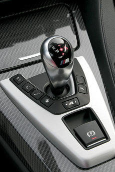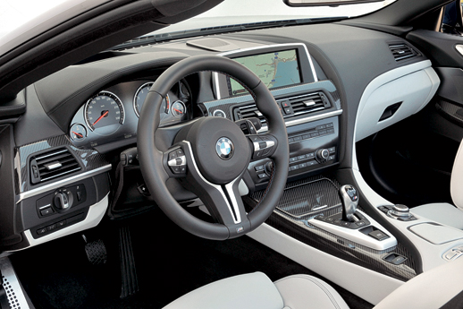 В пресс-релизах салон BMW M6 неизменно именуется кокпитом, хотя отличий от стандартной «шестерки» немного: приборы, руль с кнопками индивидуальных настроек шасси M1 и M2, уменьшенная рукоятка M-селектора и углепластиковые накладки | Слева — кнопки двухступенчатого отключения системы стабилизации, выбора режимов работы силового агрегата (меняется чувствительность педали акселератора и программа работы коробки передач), регулировки жесткости подвески, изменения усилия на руле. Внизу — клавиша выбора одного из трех режимов переключения передач: от мягкого до ударного |