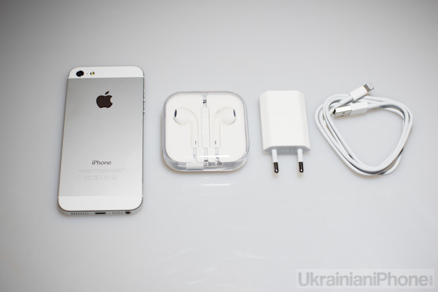Внутри преспокойно лежит объект желания миллионов. Помимо iPhone 5 комплект содержит гарнитуру нового образца EarPods в пластиковом кейсе, зарядное устройство и кабель Lightning. Документация, скрепка и наклейки яблочки, естественно, на месте.